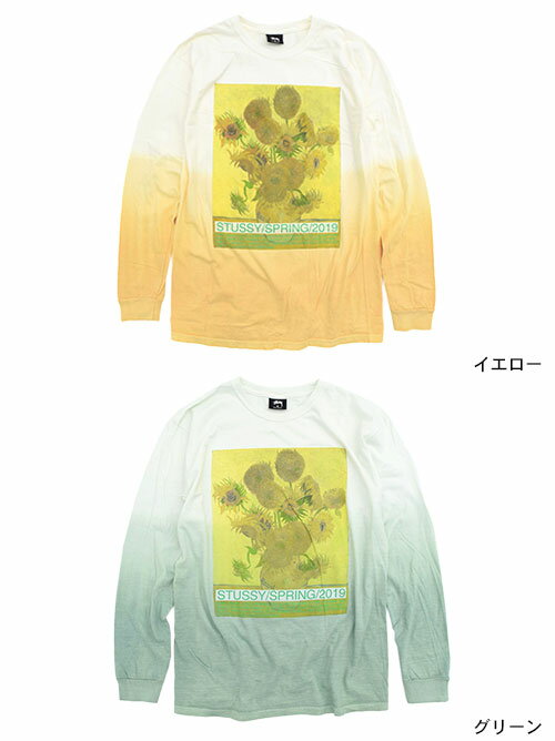 アイテム説明 40周年に向け今なお進化を続けるストリートの王者「ステューシー」! ステューシー(STUSSY)2019Springより春の新作ロンTが待望のリリース! ボディ半分をペンキに浸したかの様なディップダイ加工を施した話題作! レギュラーモデルにはない美しいグラデーションBODYはもちろん、ゴッホの名画「ひまわり」をフィーチャーしたフロントのグラフィックも見逃せない! しかも、完売必至の大本命ロンTを嬉しいリーズナブルプライスでのご紹介だけに、是非とも、お見逃しなく! 素材・注意点 コットン100% (注)こちらの商品にはグラデーション状のディップダイ加工が施されております。