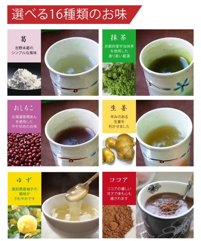 原材料 【葛】砂糖、澱粉、葛澱粉、粉飴、オリゴ糖 【抹茶】砂糖、澱粉、葛澱粉、粉飴、オリゴ糖、抹茶 【生姜】砂糖、澱粉、葛澱粉、粉飴、オリゴ糖、生姜粉末 【しるこ】砂糖、澱粉、葛澱粉、さらし餡、粉飴、オリゴ糖 【柚子】砂糖、澱粉、葛澱粉、粉飴、オリゴ糖、柚子皮粉末 【ココア】砂糖、澱粉、脱脂粉乳、乳等を主要原料とする食品(植物油脂、クリーム(乳製品)、乳糖、カゼイン)、葛澱粉、ココアパウダー、乳化剤(大豆由来)、酸化防止剤(V.E) 【シナモン】砂糖、澱粉、葛澱粉、桂皮末 【シナモン生姜】砂糖、澱粉、葛澱粉、粉飴、生姜粉末、オリゴ糖、桂皮末 【玄米茶】砂糖、澱粉、葛澱粉、粉飴、玄米茶粉末、オリゴ糖 【煎茶】砂糖、澱粉、葛澱粉、粉飴、煎茶粉末、オリゴ糖 【ミルク】砂糖、脱脂粉乳、澱粉、葛澱粉 【グラノラ】砂糖、澱粉、フルーツグラノーラパウダー(大麦粉、砂糖、きな粉(大豆)、胡麻、ココナッツ、小豆パウダー、玄米粉、デキストリン、イチゴ濃縮果汁パウダー、マンゴーピューレパウダー、プルーンエキスパウダー、パイナップル濃縮果汁パウダー)、葛澱粉、粉飴、オリゴ糖、加工澱粉、香料、野菜色素 【紫芋】砂糖、澱粉、葛澱粉、紫さつま芋パウダー、粉飴、オリゴ糖 【マロン】砂糖、澱粉、葛澱粉、マロンパウダー(デキストリン、砂糖、白餡、マロン、ラム酒)、粉飴、オリゴ糖、ソルビトール、香料、クチナシ黄色素、ターメリック色素 【メープル】メープルシュガー、澱粉、砂糖、葛澱粉、粉飴 【紅茶】砂糖、澱粉、葛澱粉、粉飴、紅茶エキスパウダー、オリゴ糖 商品説明 葛湯は、葛湯1袋をカップに入れ、熱湯100ccを注いでスプーンで手早くしっかりとかき混ぜてください。
